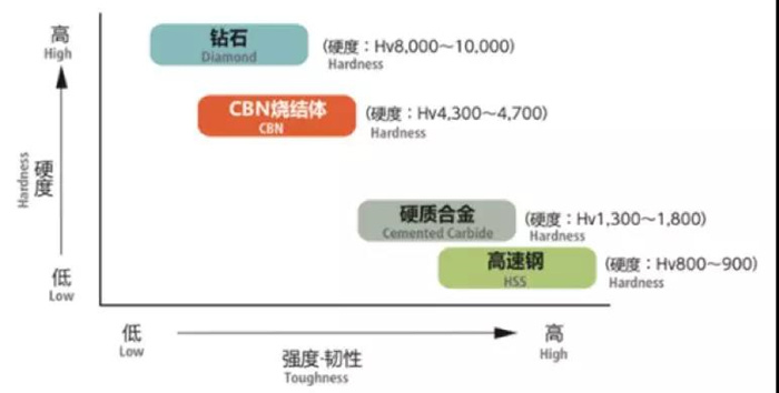 其實(shí)PCD是Polycrystalline Diamond 的英文縮寫(xiě),中文釋義為多結(jié)晶鉆石,其硬度超過(guò)諸多超硬材料(如下圖所示),是高精度鏡面加工中必不可少的“秘密武器”。