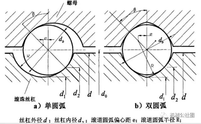 單圓弧制造工藝簡(jiǎn)單;雙圓弧制造工藝復(fù)雜,但精度保持性、載荷性能好。雙圓弧截形軸向剛度大于單圓弧截形,機(jī)床上普遍采用雙圓弧截形的絲杠。