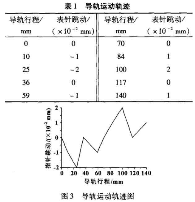 依據(jù)表頭指針的的讀數(shù),導(dǎo)軌在豎直面內(nèi)直線度較好,偏差僅有5μm,但在水平面內(nèi)有來回擺動的趨勢。相比較而言,誤差在水平面比較敏感。試驗中導(dǎo)軌從一極限位置開始,運(yùn)動140 mm,導(dǎo)軌在水平面內(nèi)的運(yùn)動軌跡如表1和圖3所示。