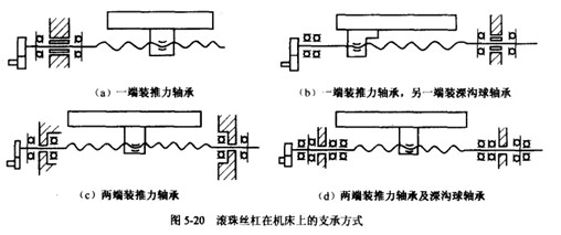 ①一端裝推力軸承。如圖5-20(a)所示,這種安裝方式的承載能力小,軸向剛度低,只適用于低轉(zhuǎn)速、中精度、短軸向絲杠,一般用于數(shù)控機床的調(diào)節(jié)環(huán)節(jié)或升降臺式數(shù)控銑床的立向(垂直)坐標中。