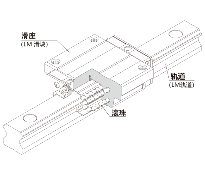 直線導軌是使用旋轉運動的軸承,使重物輕松、筆直運動的機械要素部件。ISO稱之為“Recirculating linear ball bearing”,JIS稱之為“滾珠循環(huán)直線軸承”,日本機床工業(yè)會稱之為“直線導軌”。THK株式會社將其稱為LM滾動導軌(Linear Motion Guide)。其他亦有諸如直線運動球導軌等多個名稱,有時也被稱為直線軸承,意思是用于直線運動的軸承,這個名稱是相對于用于旋轉運動的軸承而言的。