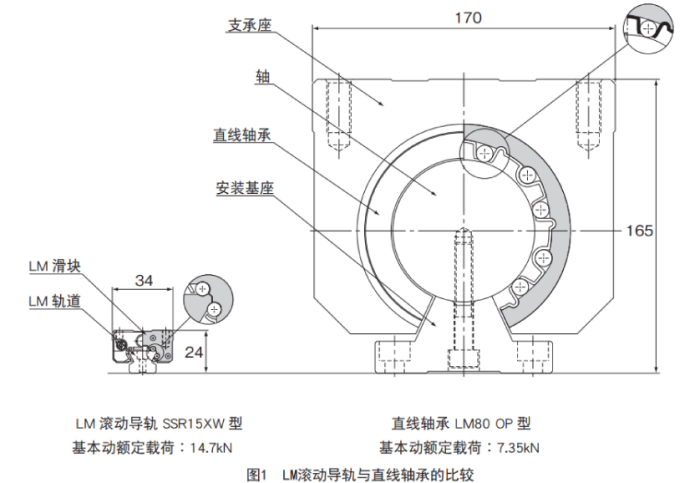 直線導(dǎo)軌將滾動(dòng)面設(shè)計(jì)成R槽形狀,使?jié)L珠和滾動(dòng)面形成“面接觸”。與直線軸承等“點(diǎn)接觸”類型的導(dǎo)向部件相比,直線導(dǎo)軌的容許負(fù)荷約為其13倍,直線導(dǎo)軌與直線軸承等“點(diǎn)接觸”的直線導(dǎo)向部件相比,即使容許負(fù)荷相同,也可以設(shè)計(jì)得更加緊湊。