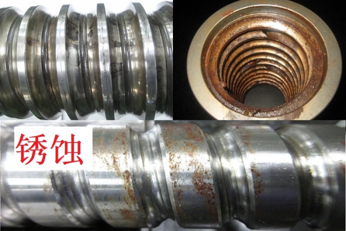 銹蝕:含水性的液體或處于高溫差、高濕度之環(huán)境,水氣導(dǎo)致螺桿產(chǎn)生銹斑,甚至長時(shí)間運(yùn)轉(zhuǎn)后甚至導(dǎo)致大面積的銹蝕。