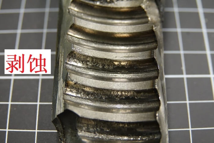 剝蝕:屬于材料接觸疲勞破壞的形式。鋼珠滾動(dòng)時(shí),軌道次表面之最大剪應(yīng)力區(qū)產(chǎn)生初始裂紋,經(jīng)由反復(fù)應(yīng)力作用后裂紋成長至材料表面,材料剝落后呈現(xiàn)坑洞的形貌。