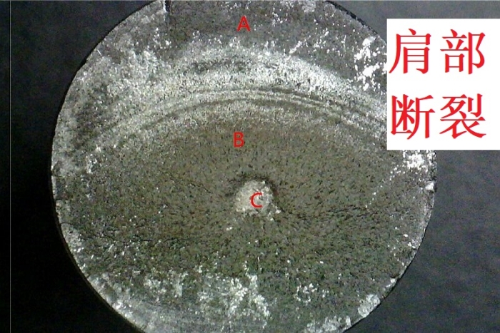 肩部斷裂:運(yùn)轉(zhuǎn)時(shí)螺桿肩部反復(fù)受到彎曲的力量,使得初始裂紋自A→B→C最終斷裂。