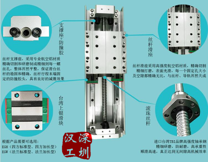 2、 滾珠絲桿型直線模組主要組成由: 滾珠絲桿、直線導(dǎo)軌、鋁合金型材、滾珠絲桿支撐座、聯(lián)軸器、 馬達(dá)、光電開關(guān)等。